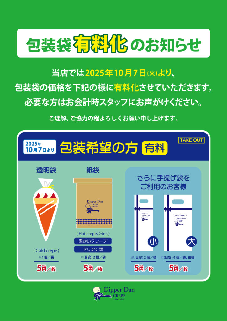 ディッパーダンでは、CO2削減と環境保全のため、包装袋を有料化させていただきます。