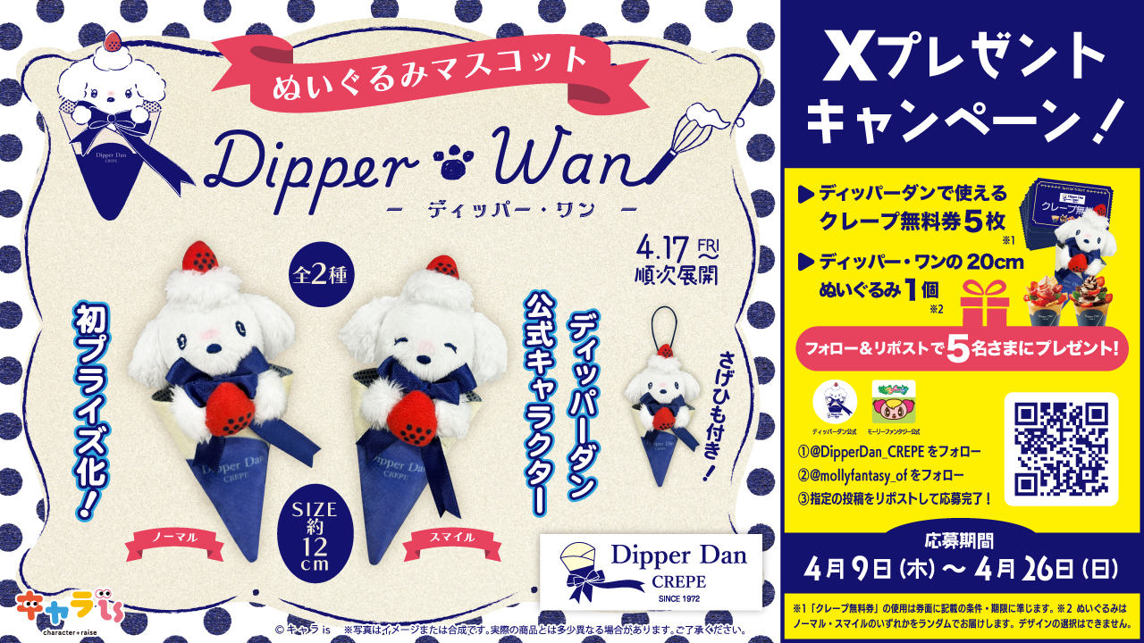 初のプライズ化を記念して”ディッパー・ワン”の魅力をたっぷりとお楽しみいただける記念キャンペーンを開催いたします。ディッパー・ワンの20cmぬいぐるみとクレープチケットが当たる「Xプレゼントキャンペーン」ほか「ぬりえイベント」など、詳しくはこちらをチェックしてね🎁🎵