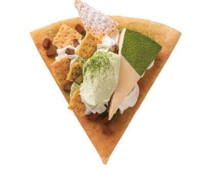 静岡県の自然豊かな山間地域で栽培された「天空の抹茶®」を、店内仕込みのふわふわ食感のクリームにたっぷりと使用し、口どけ滑らかな”ティラミスケーキ”と一緒に包み込みました。仕上げに「天空の抹茶®」と生チョコ、三角パイをトッピングした、抹茶の香りと異なる食感をお楽しみいただけるクレープです♪